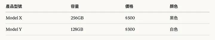 塊 1: 產品型號 | 容量 | 價格 | 顏色